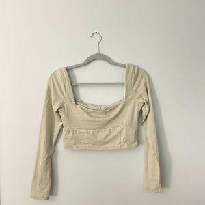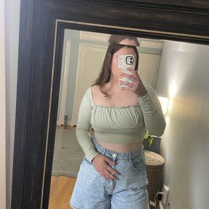 Super cute square neck crop top! Pleated puff bodice and smooth band. Rubber shoulder bands to hold sleeve in place. Ruffles along square neck line. Cute transition piece and super comfortable. Essential basic for any wardrobe. Super flattering!