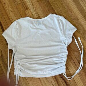 Classic white crop top with a twist. There are strings on the side that allow you to make the short shorter and they can also be tied for a bow detail.