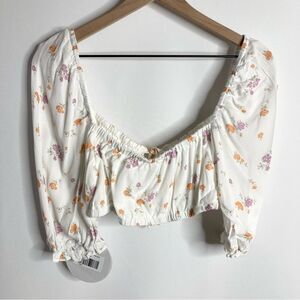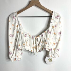Princess Polly Caribou crop top. Size 10. White with purple and orange floral print. Elastic at shoulders, neckline, and under bust.