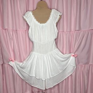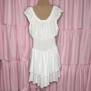Romantic and flirty one-piece romper with a layered skirted look. Features a stretchy smocked waist that defines your shape and ruffled details throughout for a feminine touch. Lightweight and breezy — perfect for date nights, brunches, or summer photoshoots.