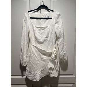 solid white Princess Polly exclusive Square neckline Balloon sleeves Wrap front look Side tie Ruffle hemline Mini length Back zipper Rayon/cotton/linen blend