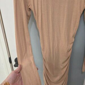 Princess Polly bodycon dress, Princess Polly ruched dress, Princess Polly tan mini dress, Princess Polly long sleeve dress, Princess Polly fitted mini dress, nude bodycon mini dress, Princess Polly party dress, Princess Polly size 6 dress, Princess Polly scoop neck dress, Princess Polly going out dress