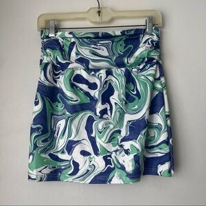 Princess Polly zOE Blue Green White Swirl Mini Skirt 4. Mini skirt. Slim fitting. 95% polyester 5% elastane. High waisted. Swirl Marble print. Ruched along waist. Good stretch. Fully lined. princess polly tag has been removed. waist is 13" across, length 16".