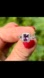 An excellent cushion cut purple stone rests in a halo of clear rhinestones that run the length of the band