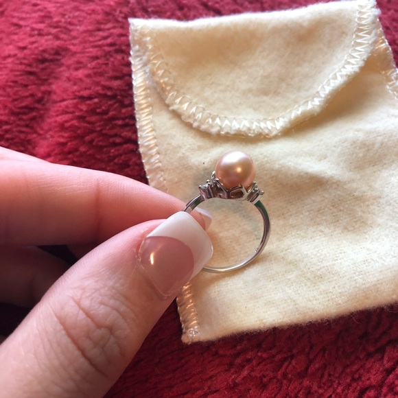 14k White Gold, Pink Freshwater Pearl Ring with Diamonds