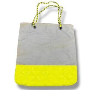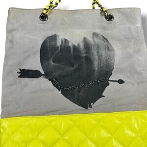 Unique Princess Vera Wang tote with quilted yellow base and gray upper featuring a heart-and-arrow graphic with chain detail. Braided rope handles with metal grommets.