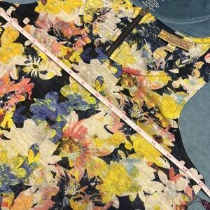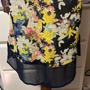 Brand new with original tags, this is a princess Vero Lang floral tunic length tank top. I love the exposed zipper in the back of this and the fabric is a beautiful floral print, mainly in blues and yellows, but it also has some pinks and greens and whites in it as well. The bottom part of this is a sheer blue chiffon, kind of looking fabric. I love the tunic length on this, be comfortable, covered, classy, see photos for measurements.