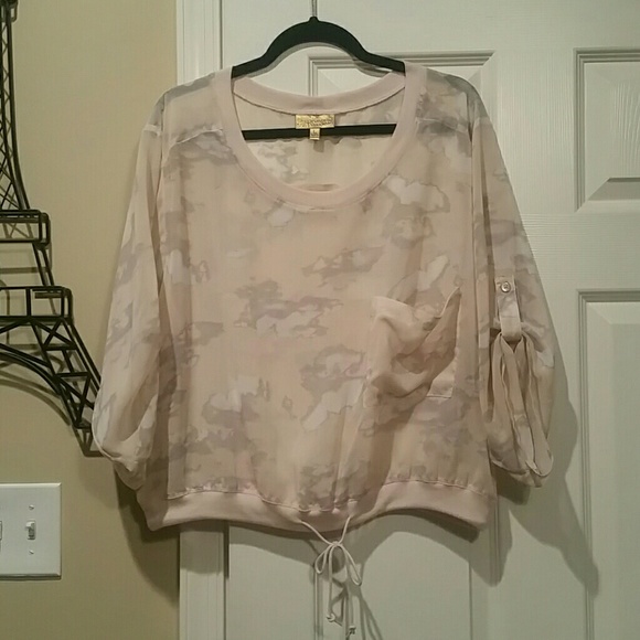 Features tie at waist and oversized left pocket, with button up sleeves. Super comfy and pairs beautifully with gray pants!