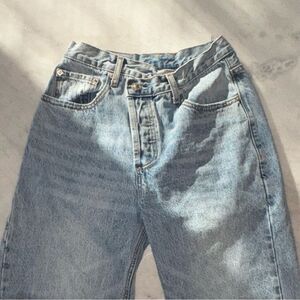 Asymmetrical waistband, relaxed straight leg, button front fastening, belt loops at waist, distressed detailing on hem