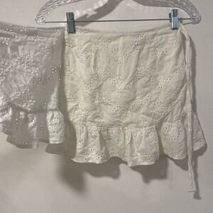 Super cute Princess Polly eyelet mini skirt in crisp white! Features a flattering wrap style with a tie waist and layered ruffle hem. Lightweight with embroidered floral eyelet details — perfect for summer, vacations, or brunch dates 🌞