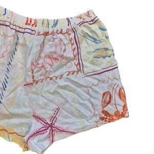 Princess Polly Women's Cream & Multicolor Under the Sea Print Viscose/Linen Elastic & Drawstring Lined Shorts w Pockets EUC sz 4