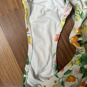 Vibrant floral print bikini bottoms with lemon orange floral print. White based botanical citrus print.