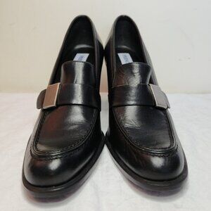 Soft Black Leather stacked Block High Heel Penny Loafers with Silver Buckle detail, 'Fog City' by Principles.