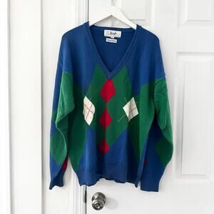 Size XL from Pringle of Scotland. Hand Intarsia. 100% cotton. Made in Hong Kong. Bold blue with red green and white argyle design throughout. Bold preppy vintage sweater. Preowned in good condition with no stains or tears.