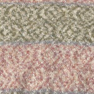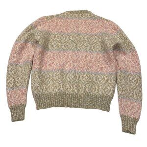 This pastel cardigan features a round neck, button front, and rib knit cuffs and hem. Excellent condition, wool cotton blend, washable, colors are green, pink, blue and ivory, size 40 S/M