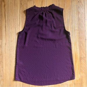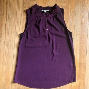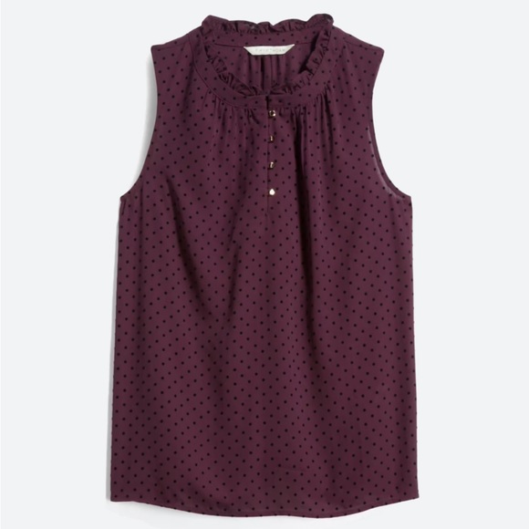 Fun sleeveless top featuring ruffle collar, square gold buttons, and subtle polka dot pattern