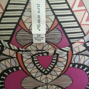This is a long print blouse 100% polyester. Light, and airy, ideal for work to evenings out.