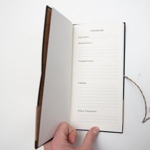 Blank pages, some lined, some unlined. Some pages have prompts for specific trip topics, others have simple headings for your own notes, and some are unlined so you can include drawings or bits of scrapbooking materials and travel moments. Has a thin ribbon/string for tying it closed or keeping your place.