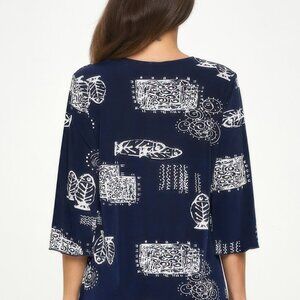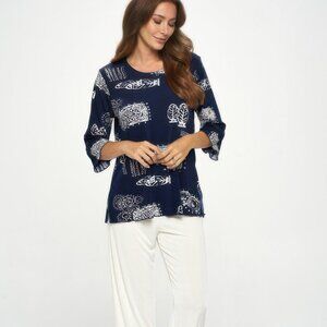 Add playful charm to your wardrobe with this printed quarter sleeve top. Designed with a flattering round neckline and whimsical lettuce hem, it offers a polished yet relaxed silhouette. The wrinkle-resistant fabric makes it perfect for on-the-go lifestyles, while the stretch blend ensures a flexible, flattering fit. Made in the USA, it’s a reliable staple with a fun twist.