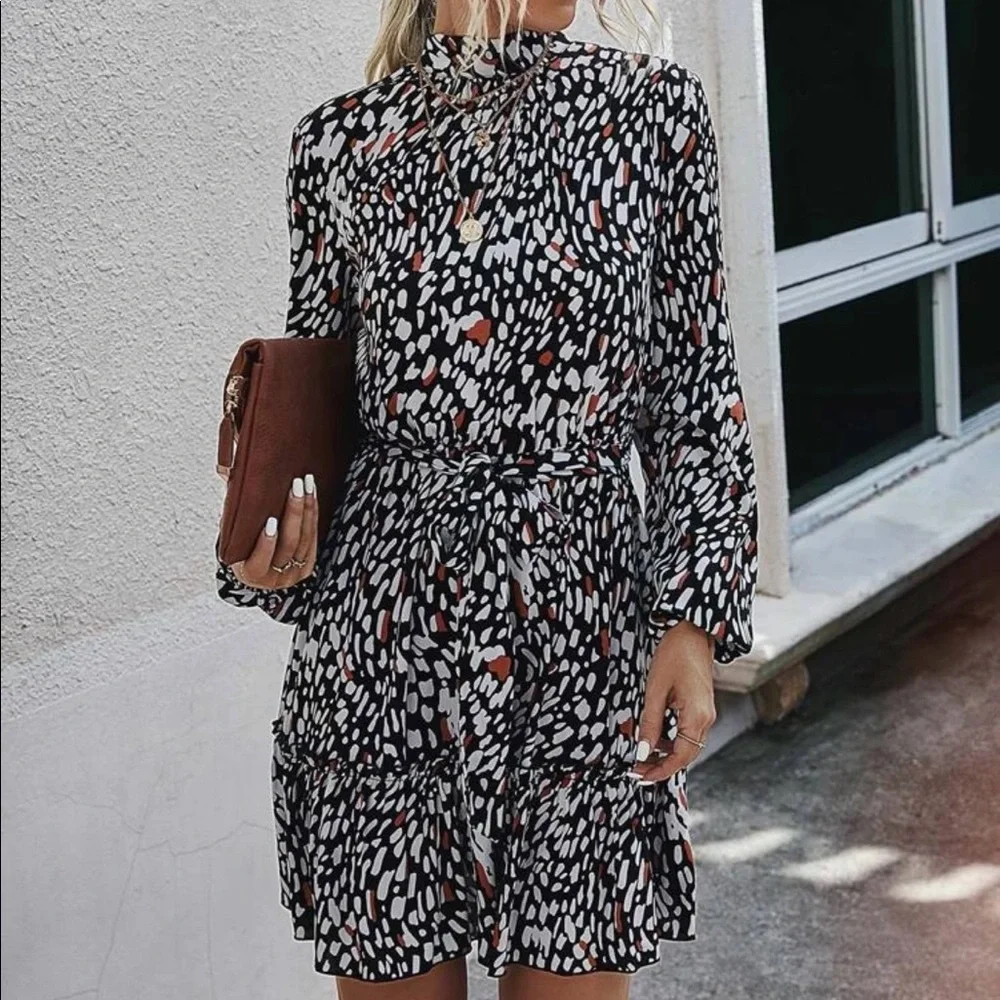 Multicolor pattern ruffle dress with key hole back and tied belt. This is very short, I am 5’7 and it is too short for me.