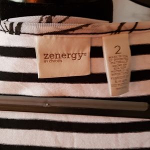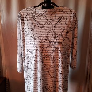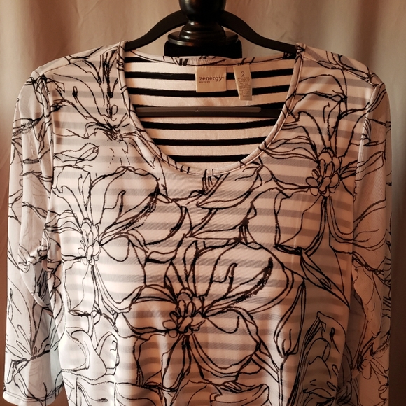 Chico's Black and White print tunic lined with black and white striped jersey. Sleeves are 3/4 length. Body and sleeves are Polyester/Spandex-Lining is Rayon/Spandex