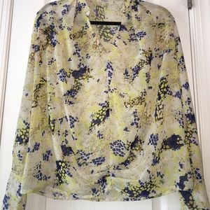 Tan/cream sheer top with yellow and blue design throughout. Sleeves can be rolled up to 3/4 length. Worn once!