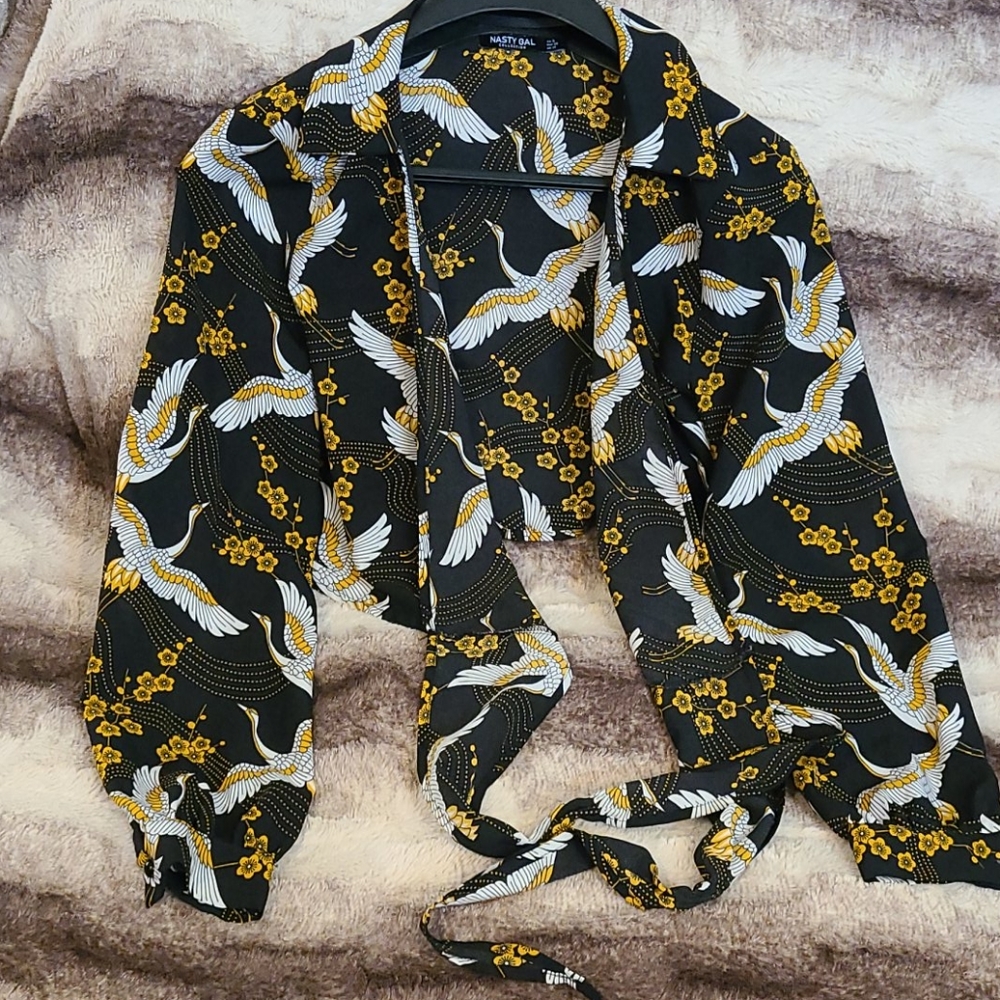 (Bird)Printed Cropped Tie Front Blouse With Collar