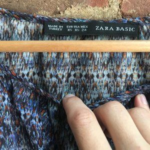 Beautiful printed flowy blouse with gold buttons at wrist and string tie at neck