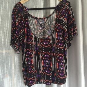 Vasia printed short sleeve top with black, purple, and coral color in print. Low back style with strap across top. Material 100% rayon