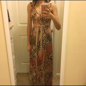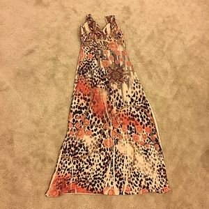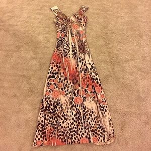 This slimming maxi dress has a gorgeous abstract print on it that seems to move when walking in it!❤️100% perfect condition, only worn twice and from a pet and smoke free home!😘Lightly padded in the chest area, small busted gals won't even need to bother with a bra for this dress! I absolutely LOVE the cut and neckline of this beautiful dress as it is very flattering and feminine👗This would go great with tan wedges or flats. So pretty, breathable, and PERFECT for this summer!☀️