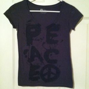 Dark gray cotton t shirt with "peace" printed in black. V-neck