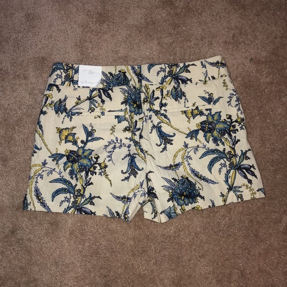Cream colored shorts with a blue and yellow floral paisley design. Very slimming pair of shorts with light material for the heat.
