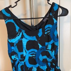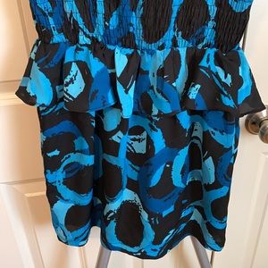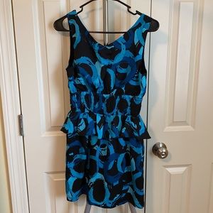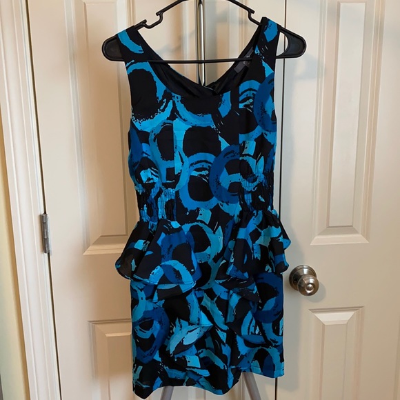 Black background, blue/teal circle print, stretchy bodycon dress with ruffles on hips and down front. From Forever21. Small keyhole back detail. Size small. Worn only a few times, excellent condition.