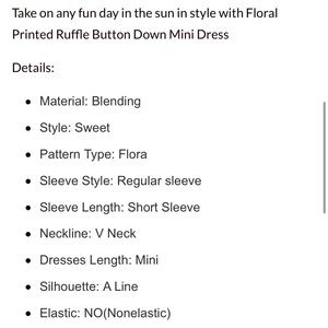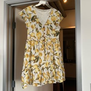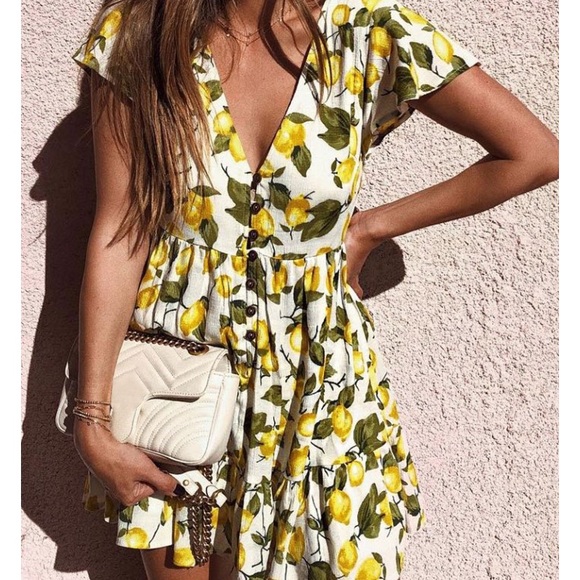 Brand new, never been worn! Floral / lemon printed ruffle button down mini dress. Short sleeve, v-neck. Size: Small