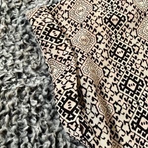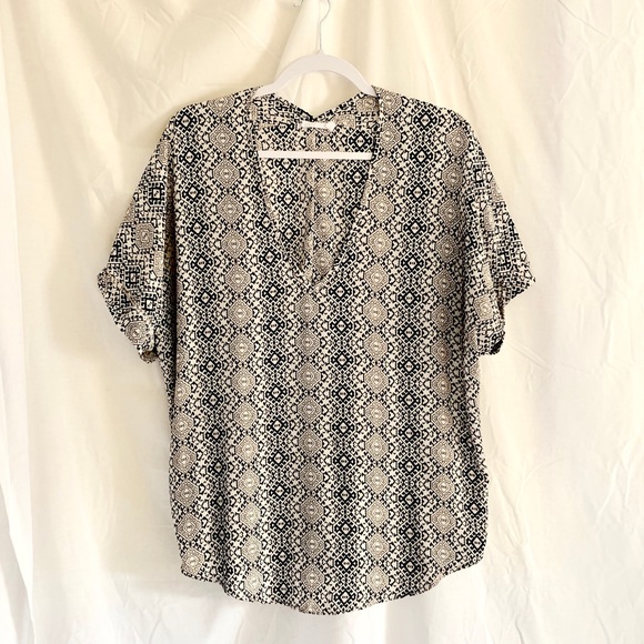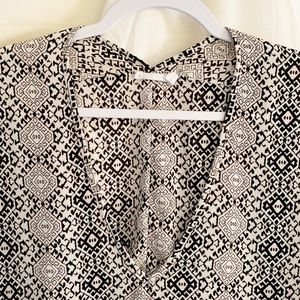 Pale pink, white and black print Loose and practically wrinkle resistant V-neck Cuffed, short sleeves Excellent Used Condition