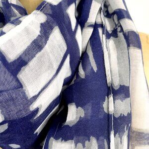 Call it geometric, call it an abstract plaid, call it perfect for summer to wear as a scarf or wrap. By Printed Village, lightweight white fabric with blue and gray design. 100% polyester.