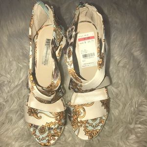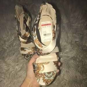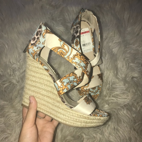 Printed satin design wedges featuring wrapped espadrille wedge platform, tags still attached never worn