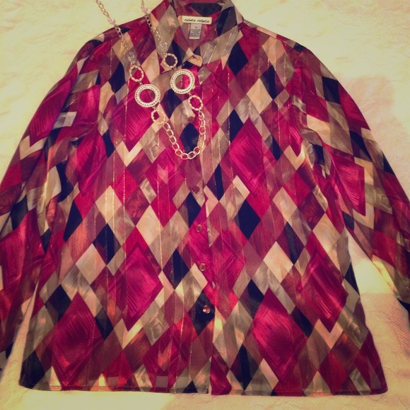A printed button down blouse, medium but could also fit a large. Incorporated with gold thread striped. Necklace not included.