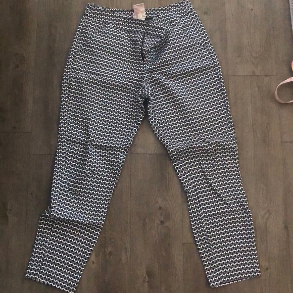 27” inseam from the crotch to the bottom hem. Pockets on the front and back, with belt loops. Classic fit. Navy blue and white pattern.