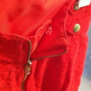 Bright red, floral printed. High-waisted. Gold buttons on front and back. Zipper and button on back. Worn a handful of times.