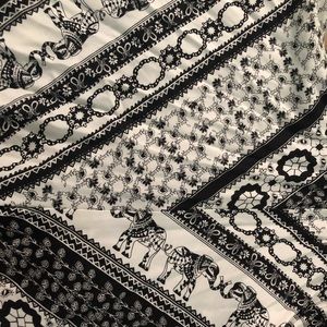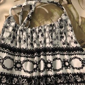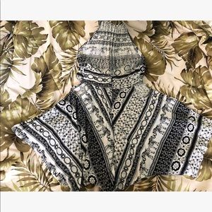 Flowy romper perfect for summer! On the side the right and the left there’s a cut that shows some bit of skin. Also there’s a zipper in the back not stretchy at all. Never been worn