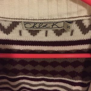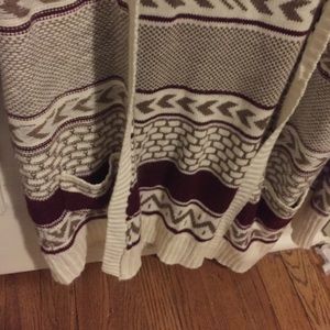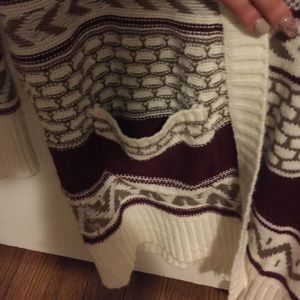 Aztec printed cardigan bought from Pacsun. Very cute and warm and goes well with jeans or leggings. Only worn twice and in great condition. Is a maroon color with gold colored accents with a cream colored white!