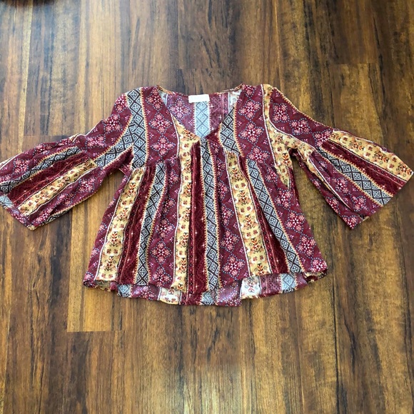 Adorable top for transitioning into fall! Bell sleeves three quarter length. V-neck. Size small, EUC. Like new.