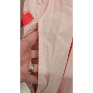 Enchanting charm radiates from this delightful nightgown, ready to bring a touch of whimsy to your bedtime routine. The soft pink hue is playfully adorned with vibrant red hearts, creating a cheerful and inviting aesthetic. It features a graceful square neckline, pintuck detailing, and a delicate button-down placket that adds a touch of sophistication. The short sleeves and ruffled hemline enhance the garment's sweet and comfortable appeal. Perfect for lounging at home, enjoying a relaxing spa day, or as a thoughtful gift for a loved one.