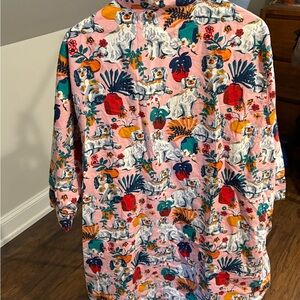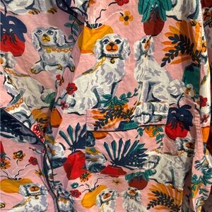 Vibrant shirt with a cute doggy print. Features pink, blue, orange, and green colors. Perfect for a bold look. 3/4 length sleeves and has pockets!