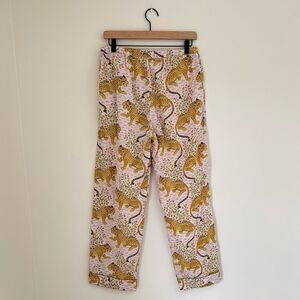 Stylish pajama pants and topwith a bold leopard print. Features pink background with yellow leopards. Comfortable and chic for lounging.