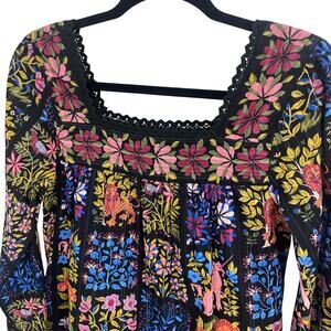 • Features: Long sleeve, Square neckline with black lace trim, Black with multicolor flowers and animals printed all over in a patchwork pattern, Opening Day Top by Printfresh