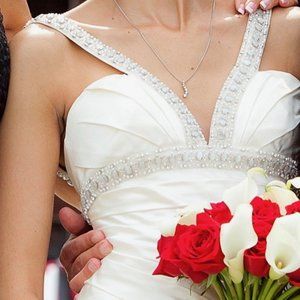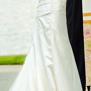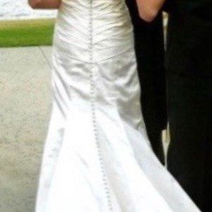 Dress is gorgeous 100% silk shell Priscilla of Boston gown (made 2011) with short flowing train and studded with moonstones along full length of straps + around bust. Color is very light ivory, not stark white. There are buttons from the hook closure at mid-low back all the way to the end of the train. The buttons are only functional at back of dress, buttons on train are accessory. Dress has bustle loops. Wedding was in May in the southeast - warmer weather and the dress was comfortable w/o being too hot.