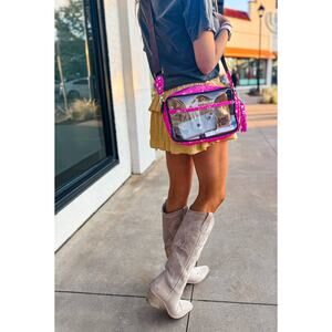 Priscilla Clear Cowhide Crossbody Purse Bag Concert Festival Stadium Pink Silver