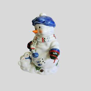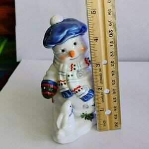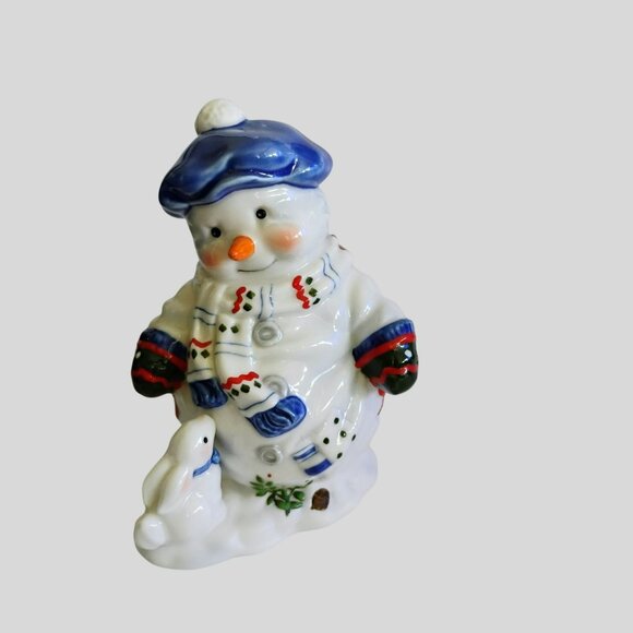 This collectible ceramic snowman figurine, designed by Priscilla Hillman for Enesco, features intricate details, vibrant colors, and a playful bunny companion, ideal for seasonal displays.